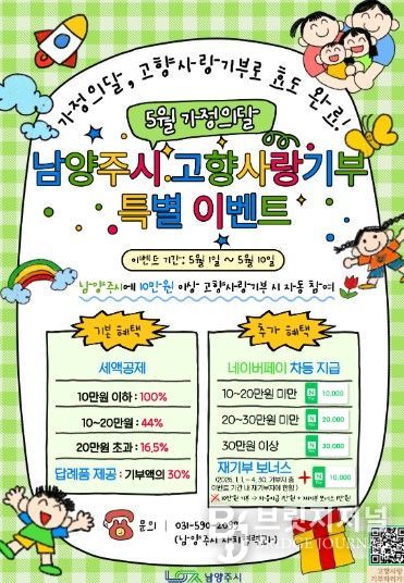브릿지저널 김경미 기자 | 남양주시는 가정의 달을 맞아 5월 1일부터 10일까지 고향사랑기부 특별선물 증정 이벤트를 추진한다고 30일 밝혔다.