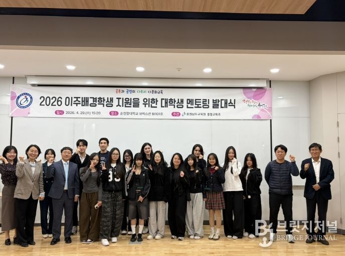 브릿지저널 정보영 기자 | 충남교육청은 29일, 순천향대학교(아산)에서 순천향대 지도자 학생 6명과 온양용화고·아산충무고 학생 20명, 담당 교사 등 30여 명이 참석한 가운데 ‘2026 이주배경학생 지원을 위한 대학생 지도 발대식’을 개최했다.