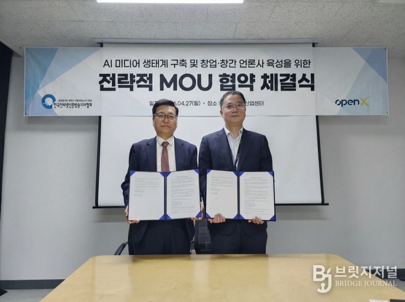 브릿지저널 김경미 기자 | 한국인터넷신문방송기자협회(회장 전병길, 이하 협회)와 오픈엑스(대표 김미진)는 지난 2026년 4월 27일 서울 상암동 DMC첨단산업센터에서 업무협약(MOU)을 체결하고, 제휴 언론사 육성과 건강한 미디어 생태계 강화를 위해 적극 협력하기로 뜻을 모았다.