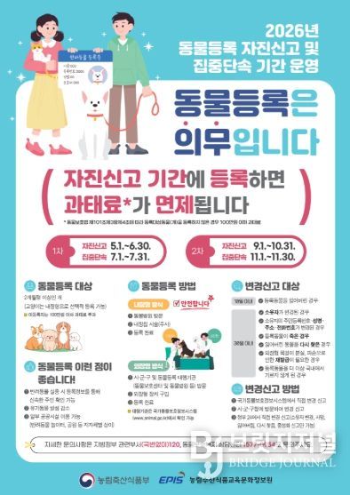 제주특별자치도는 성숙한 반려동물 문화 정착과 유기·유실동물 발생 예방을 위해 2026년도 동물등록 자진신고 기간을 연 2회 운영한다. 이 기간에는 미등록 및 변경사항 미신고에 대한 과태료가 면제된다.
