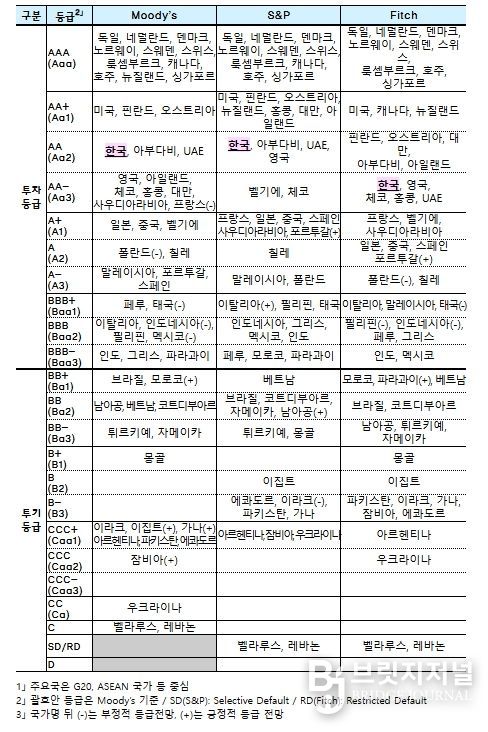 브릿지저널 정보영 기자 | 국제 신용평가사 S&P는 4.29일 한국의 국가신용등급 및 전망을 ‘AA, 안정적’으로 유지한다고 발표했다. S&P는 중동 분쟁에 따른 글로벌 에너지 시장의 불안이 ’26년 한국 경제의 위험 요소이나, 반도체 등 산업 부문의 경쟁력과 재정정책이 이러한 부담을 완화할 것이라고 전망했다. 또한, 향후 3~4년 동안 대부분의 고소득 국가들보다는 높은 평균 성장률을 유지할 것으로 예상했다.