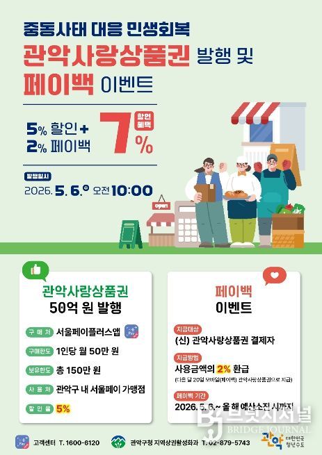 브릿지저널 김경미 기자 | 관악구가 최근 중동 사태 여파로 인한 고유가·고물가로 위축된 소비 심리 회복을 도모하고자 ‘관악사랑상품권’을 추가 발행해 민생 경제에 훈풍을 불어넣는다.