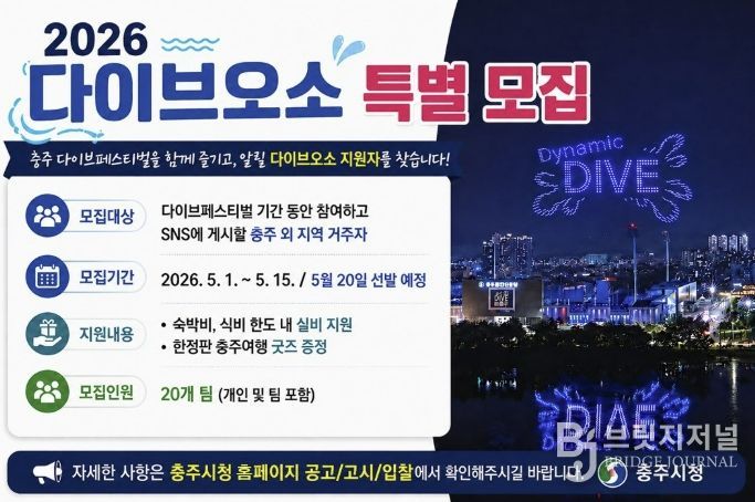 브릿지저널 김경미 기자 | 충주시가 ‘2026 충주 다이브 페스티벌 with MyK FESTA’을 맞아 지역 관광의 매력을 널리 알릴 특별 홍보단 ‘다이브 오소(O-SO) 충주’ 참여자를 모집한다고 밝혔다.