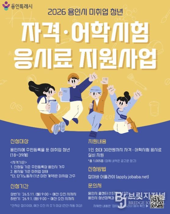 브릿지저널 김경미 기자 | 용인특례시는 취업을 위해 어학과 자격증 시험 등을 준비 중인 청년을 위해 응시료 30만 원을 지원한다고 30일 밝혔다.