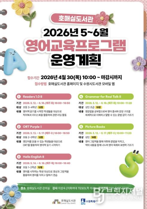 브릿지저널 김경미 기자 | 수원시 호매실도서관이 5~6월 영어교육 프로그램 참가자를 모집한다. 이성숙 강사(이화여대 TESOL학 석사)가 강의한다.