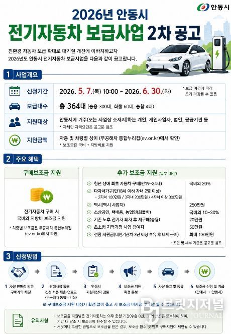 브릿지저널 정보영 기자 | 안동시는 최근 지속되는 고유가 현상에 선제적으로 대응하고 시민의 전기자동차 구매 수요를 충족하고자, 당초 7월로 예정됐던 2차 보급 사업을 5월로 앞당겨 추진한다고 4월 30일 밝혔다. 시는 이번 조기 시행을 통해 친환경 무공해 자동차 보급을 가속화하고 시민들의 경제적 부담을 완화할 방침이다.