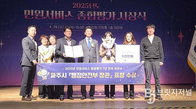 브릿지저널 김경미 기자 | 파주시는 지난 29일 정부세종청사 대강당에서 열린 녩년 민원서비스 종합평가’시상식에서 행정안전부 장관 표창을 수상하고, 시상금으로 특별교부세 6천만 원을 확보했다.
