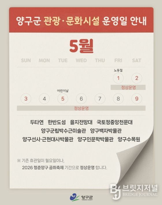 브릿지저널 윤나영 기자 | 양구군은 ‘2026 청춘양구 곰취축제’ 기간 동안 관광객 편의 증진과 지역 관광 활성화를 위해 관내 주요 관광·문화시설을 휴관일 없이 정상 운영한다.