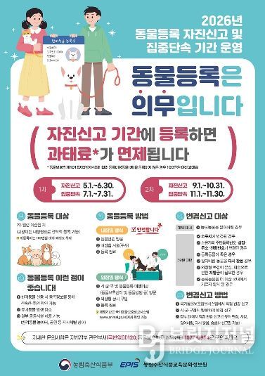 브릿지저널 김진석 기자 | 대구광역시는 반려견의 유기·유실을 방지하고 보호자의 책임 의식을 강화하기 위해 5월 1일부터 6월 30일까지 두 달간 ‘2026년 상반기 반려견 동물등록 자진신고 기간’을 운영한다.