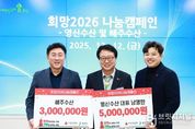 브릿지저널 정보영 기자 | 울진군은 지난 12월 12일 재경울진경제인협의회로부터‘희망2026 나눔캠페인’성금 3,000만 원을, 명예회장이자 울진 아너 3호 동아베스텍(주) 배준집 대표로부터 성금 3,000만 원을 각각 기탁받았다. 재경울진경제인협의회는 타지에 거주하고 있는 울진 출신 출향 경제인들로 구성된 단체로 매년 고향 울진을 방문해 성금 기탁과 나눔 활동을 꾸준히 이어오고 있다. 재경울진경제인협의회 명예회장인 배준집 동아베스텍(주) 대표는 성금기탁과 함께 고향사랑기부제에 2,000만 원을 추가로 기부하며 고향 사랑을 실천했다. 배준집 대표는“이웃사랑 나눔을 위한 캠페인에 동참하게 되어 기쁘다”며“올해 11월 우리 기업이 은탑산업훈장을 수상한 만큼, 이번 기부를 통해 그 기쁨을 지역사회와 함께 나누고 싶다”라고 말했다. 장현덕 재경울진경제인협의회장은“협의회 회원들이 뜻을 모아 마련한 성금이 고향의 어려운 이웃들의 따뜻한 연말 보내기에 도움이 되기를 바란다”라고 말했다. 울진군 관계자는“해마다 울진의 어려운 이웃들을 잊지 않고 지속적으인 나눔을 실천해주시는 출향 경제인들께 깊이 감