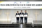 브릿지저널 김경미 기자 | 안산시는 지난 26일 안산상공회의소 그레이트홀에서 경기지방고용노동청 안산지청, 안산시 공동근로복지기금 1호 법인과 함께 ‘안산시 공동근로복지기금 조성 및 지원을 위한 상생협약’을 체결했다고 27일 밝혔다. 이번 협약은 지역 중소기업과 노동자가 함께 참여하는 공동근로복지기금 조성을 통해 대·중소기업 간 복지 격차를 완화하고, 상생과 연대의 노동환경을 조성하기 위해 마련됐다. 앞서 시는 지난해 7월 ‘안산시 공동근로복지기금 지원 조례’를 제정하고, 기초자치단체 최초로 공동근로복지기금 지원사업을 시행했다. 이는 지방정부와 중앙정부, 기금법인이 함께하는 3자 협력 모델을 구축했다는 점에서 의미가 있다. 이날 협약식에는 이민근 안산시장을 비롯해 양승철 경기지방고용노동청 안산지청장과 장현준 기금법인 대표, 참여기업 관계자 등 100여 명이 참석한 가운데 공동근로복지기금 사업 출범을 기념하고 상생 협력 의지를 다졌다. 협약에 따라 안산시는 공동근로복지기금 조성 및 운영을 위한 행정·재정적 지원을 담당하고, 경기지방고용노동청 안산지청은 ▲정책 반영과 제도 개선 ▲참여기업 확대 및 우수사