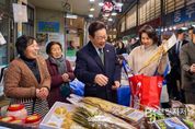 브릿지저널 김경미 기자 | 이재명 대통령과 김혜경 여사는 오늘 낮, 설 명절을 앞두고 충북 충주시에 위치한 무학시장을 찾아 지역 세밑 물가를 점검하고 상인들을 만나 현장 의견을 청취했다. 무학시장은 지난 1978년 노점상들의 정착을 위해 개설된 전통시장이며, 이번 방문은 설 민심을 청취하기 위한 민생 행보의 일환이다. 이 대통령과 김 여사는 시장 내 여러 상점을 들러 “새해 복 많이 받으세요”라며 인사를 했고, 상인과 시민들은 환호와 박수로 이 대통령 부부를 맞았다. 이 대통령 부부에게 더덕을 판매한 상인은 “덕분에 마수걸이를 한다”며 “오늘 장사가 잘될 것 같다”고 말해 웃음을 자아냈다. 다른 상인들도 “힘나게 해주셔서 감사하다”, “너무 고생 많으시다”며 인사를 전했다. 이 대통령 부부는 황태포, 시금치, 곶감과 깐밤 등 제수용품과 먹거리를 구입했고 백도라지, 마른 멸치, 배추전 등을 즉석에서 맛보기도 했다. 이 대통령 부부는 온누리상품권과 현금으로 결제했다. 김 여사가 물건을 고르는 사이 이 대통령은 상인들에게 “장사는 잘 되느냐”, “곧 설인데 어떠시냐”고 물었다. 정육점 사장은