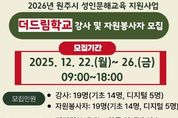 브릿지저널 윤나영 기자 | 원주시 평생교육원 학습관에서 12월 22일부터 26일까지 2026년 원주시 성인문해교육 지원사업 '더드림학교' 강사 및 자원봉사자를 모집한다. 이번 문해교육 강사는 학령기 교육의 기회를 놓친 비문해 성인을 대상으로 더디딤 6개반, 더채움(성인생활문해) 5개반, 더열림(찾아가는 성인문해교실) 3개반, 더터치(디지털문해) 5개반 등 전문적인 문해교육을 수행할 교육강사 19명, 자원봉사자 19명, 총 38명을 모집한다. 지원자는 신청서를 작성해 평생교육원 학습관에 방문 접수하면 되고, 선발은 1차 서류 심사와 2차 면접 및 수업 시연으로 이루어진다. 심사에서는 ▲강사 경력 및 자격 ▲강좌 운영 적합성 ▲지원자의 전문성 ▲강의 계획의 적정성 ▲강의 능력 등을 종합적으로 평가해 최종 합격자를 선정한다. 윤석재 학습관장은 “비문해 어르신들에게 질 높은 문해교육을 제공하여 학습자들의 자존감 향상에 기여할 역량 있는 강사와 자원봉사자의 많은 관심과 참여를 기대한다.”라고 말했다.