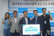 브릿지저널 윤나영 기자 | 부산 동구, 동구종합사회복지관은 근로복지공단 부산지역본부에서 10월 1일 추석 명절을 앞두고, 동구 지역 소외계층에게 힘이 될 수 있도록 50만 원의 후원금을 동구종합사회복지관에 전달했다고 밝혔다. 해당 성금은 동구 지역 내 취약계층의 추석 명절맞이 지원으로 활용될 예정이다. 이외에도 근로복지공단 부산지역본부에서는 임직원들이 매주 수요일마다 복지관 4층 장난감도서관을 방문해 어린아이들이 안전하게 놀 수 있도록 장난감 소독 봉사활동에 꾸준히 참여하고 있다. 민병창 근로복지공단 부산지역본부장은 “어른, 아이 할 것 없이 모두가 행복하고 즐거운 동구가 될 수 있도록 앞으로도 다양한 활동을 통해 사회공헌사업을 이어나가겠다” 고 밝혔다.