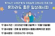 브릿지저널 김경미 기자 | 고성군은 10월 2일부터 13일까지 고성군종합사회복지관에서 독거노인 어르신을 대상으로 독거노인 자립 및 사회관계 형성 프로그램 ‘혼자라도 좋은 일상레시피’ 참여자를 모집한다. ‘혼자라도 좋은 일상레시피’ 프로그램은 정서적 안정, 사회적 관계 형성 및 자립 역량 강화를 통해 독거 노인의 건강한 일생생활 도모 기회를 제공하고자 매주 수요일 △공예체험 △천연아로마체험 △요리교실 △신체활동 △미술심리(만다라) △디지털 교육 등 다양한 주제로 10월 15일부터 12월 3일까지 총 8회기 진행될 예정이다. 신청 대상은 고성군에 거주하는 홀로 지내시는 어르신 누구나 참여할 수 있다. 참여 신청은 종합사회복지관 분관에 방문하거나 전화로 신청할 수 있다. 고성군 공식 밴드, 고성군종합사회복지관 홈페이지를 통해 프로그램 참여자 모집 안내를 확인 할 수 있으며 문의 사항은 고성군종합사회복지관으로 문의하면 된다.