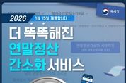 브릿지저널 김경미 기자 | 더 똑똑해진 연말정산 간소화 서비스 2026년 1월 15일 개통합니다! ■ 더~욱 새로워진 연말정산 간소화 서비스 기존 42개 자료+ 3개 자료 추가 1. 발달 재활 서비스 이용 증명 2. 장애인 활동 지원 급여 본인 부담금 자료 3. 체육시설 이용료 자료 ■ 더~욱 정교해진 소득 기준 초과 부양가족 명단 제공 소득 금액 100만 원 초과 부양가족에 대한 정보 연말정산 간소화 서비스 자료 조회 화면에서 안내 * 근로소득만 있는 경우 총급여 500만 원 - 소득 기준 초과 부양가족 내역 * 자세한 사항은 국세청 블로그를 참고해주세요! ■ AI 전화 챗봇 상담 - 국세 상담센터: ☎126→0번→0번(상담사 또는 AI 상담사 연결) - 세무서: 대표번호→2번→6번(AI 상담사 연결) (AI 상담사) · 주민등록번호 입력 후 본인인증 연말정산 간소화 자료 일괄 제공 현황, 부양가족의 간소화 자료 제공 동의 현황 등 · 생성형 AI 챗봇 상담 시범 운영 경로→홈택스 접속→홈택스 퀵메뉴→챗봇 상담 클릭 *홈택스 ■ 연말정산 유의
