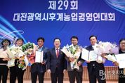 브릿지저널 정보영 기자 | 이장우 대전시장이 19일 대전시 농업기술센터에서 열린 제29회 한국후계농업경영인 대전시대회 개회식에서 대전 농업 발전에 기여한 공로로 한국후계농업경영인 대전시연합회로부터 감사패를 받았다. 이번 행사는 ㈔한국후계농업경영인 대전시연합회 주최로 열렸으며, 대전지역 농업인과 농협 관계자, 도시민 등 300여 명이 참석해 농업의 미래를 함께 논의하는 자리가 됐다. 이장우 대전시장은 수상 소감에서 “농업은 국가의 근간 산업으로 식량 안보와 생태계 보전에 중요한 역할을 하고 있다”라며 “과학수도 대전에 걸맞은 첨단기술을 활용해 스마트농업 기반을 조성하고 미래 농업의 성장 동력을 확보하는 데 최선을 다하겠다”라고 말했다.