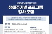 브릿지저널 김경미 기자 | 인천시 남동구 구립도서관은 3~12월까지 운영하는 ‘2026년 상·하반기 생애주기별 프로그램’에 함께 할 프로그램 강사를 공개 모집한다고 12일 밝혔다. 올해 구립도서관 4개관(남동논현, 소래, 서창, 만수2동어린이도서관)의 생애주기별 프로그램은 10개 분야로 구성돼 운영될 예정이다. 강사 모집은 유아·아동 대상의 영어·한국사·생태·미술·전래놀이·경제 등 8개 강좌와 성인 대상의 책 놀이·영어독서 지도 교육 등 2개 강좌를 대상으로 한다. 관련 분야 전공자, 교육과정 이수자, 자격증 소지자, 강의 경력자라면 누구나 강사로 지원할 수 있다. 지원자는 강사지원서·강의계획서·자기소개서 등 서류를 준비해 1월 16일까지 남동논현도서관 또는 서창도서관에 방문하거나 이메일을 통해 제출하면 된다. 구는 매년 강사 공개 모집을 통해 여러 분야의 우수한 강사를 발굴·선발하여 생애주기별 프로그램을 진행하며, 지역주민의 교육적 삶의 질 향상과 독서문화 활성화를 통해 지역 내 독서문화 진흥을 도모할 수 있기를 기대하고 있다. 자세한 사항은 남동구립도서관 홈페이지 또는
