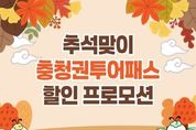 브릿지저널 김경미 기자 | 충청광역연합(연합장 김영환)은 민족 대명절 추석을 맞아 충청권 대표 관광상품 ‘충청권투어패스’의 특별 할인 프로모션을 진행한다고 밝혔다. 충청권투어패스는 대전·세종·충북·충남 4개 시·도의 주요 관광지를 하나의 패스로 편리하게 즐길 수 있는 통합 이용권이다. 평상시에도 관광지 정상 요금 대비 약 50% 저렴하게 이용할 수 있는 합리적인 관광상품이면서 전체 가맹점 중 이용객이 원하는 관광지를 자유롭게 선택할 수 있는 장점이 있다. 이번 프로모션에서는 충청권투어패스 ‘빅2(2곳 이용권)’ 상품을 정상가 29,900원에서 2만원 할인된 9,900원에 제공한다. 판매 수량은 총 3천 매 한정이며, 9월 26일부터 10월 12일까지 네이버 스마트스토어를 통해 구매할 수 있다. 사용 기한은 10월 31일까지다. 한편, 충청광역연합은 충청권투어패스의 상품 경쟁력 강화를 위해 관광지나 체험시설 뿐 아니라 식음료 업종(카페 등)까지 신규 가맹점 모집을 확대하고 있다. 가맹점으로 등록하면 투어패스 공식 채널 홍보와 주요 온라인 판매망 연계 등 다양한 혜택을 누릴 수 있어 관광객 유입 효과가 기대된다.