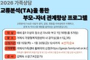 브릿지저널 김경미 기자 | 거제시가족센터는 오는 2일부터 진행하는'교류분석(TA)을 통한 부모–자녀 집단상담 프로그램' 참여자를 모집한다고 밝혔다. 프로그램 주요 내용은 자아상태검사, 부모-자녀 간 의사소통 패턴 이해하기, 갈등 상황에서 안정적인 대화법 등으로 청소년의 마음 성장과 가족관계 회복을 지원하는 데 목적이 있다. 모집 대상은 예비 중학생 이상의 청소년 자녀와 양육자 5가정이며, 거제시가족센터 홈페이지를 통해 신청‧접수 가능하다. 자세한 문의는 거제시가족센터로 하면 된다. 류주진 센터장은 “방학은 가족이 서로를 이해하고 관계를 돌아볼 수 있는 좋은 시기”라며 “부모와 아이가 한 걸음 더 가까워지는 시간이 되길 바란다”고 밝혔다.
