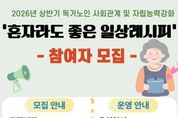 브릿지저널 김경미 기자 | 고성군이 운영하는 고성군종합사회복지관은 오는 3월 16일부터 관내 65세이상 독거노인을 대상으로 2026년 상반기 독거노인 사회관계 및 자립능력강화 프로그램'혼자라도 좋은 일상레시피' 참여자 20명을 모집한다. 이번 프로그램은 2026년 지방소멸대응기금을 활용해 추진된 사업으로 지역적 특성을 반영해 기획됐으며, 혼자 생활하는 어르신들의 정서적 안정과 사회관계 형성을 지원하고, 일상생활에 필요한 다양한 활동을 통해 자립능력 향상을 돕기 위해 마련됐다. 프로그램은 2026년 4월 1일부터 6월 10일까지 매주 수요일 오전 10시부터 12시까지 총 10회기로 운영되며, 내용은 정서안정 활동을 비롯해 △요리교실 △손바느질 △영양 및 위생 △악기 배우기 등 참여형 체험 프로그램으로 구성되어 어르신들이 서로 소통하고 교류하며 즐겁게 참여할 수 있도록 운영될 예정이다. 모집기간은 2026년 3월 16일부터 3월 27일까지 선착순 모집이며, 고성군 관내 65세 이상 독거노인 20명을 대상으로 한다. 참여를 희망하는 군민은 고성군종합사회복지관 분관(송학로 47-3)에 방문하거나 전화를 통