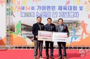 브릿지저널 김경미 기자 | 합천군은 26일 가야면 해인중학교 운동장에서 열린 제54회 가야면민체육대회 및 제29회 노인의 날 기념행사 현장에서 부산·울산지역 향우가 고향사랑기부금 600만원을 기탁했다고 밝혔다. 이날 기탁은 가야면 체육회가 주최한 가야면민체육대회 행사 중 진행됐으며, 부산향우와 울산향우(익명 요청)가 각각 300만원씩 고향사랑기부금을 전달했다. 기탁식에는 두 향우가 직접 참석하지 못했으며, 최덕규 전 가야농협장과 임재후 가야면체육회장이 대신 전달해 뜻깊은 마음을 전했다. 기탁된 성금은 합천군 고향사랑기금으로 적립돼 지역 복지증진과 주민 생활여건 개선을 위한 사업에 사용될 예정이다. 김윤철 합천군수는 “타지에서도 늘 고향을 잊지 않고 따뜻한 정성을 보내주신 향우 여러분께 깊이 감사드린다”며 “소중한 기탁금은 지역사회를 위해 의미 있게 활용하겠다”고 전했다. 고향사랑기부제는 개인이 주소지를 제외한 지방자치단체에 연간 2,000만 원 이하의 금액을 기부할 수 있으며, 세액공제(10만 원까지 전액, 초과분 16.5%)와 함께 30% 상당의 답례품(지역특산물·합천사랑상품권 등