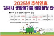 브릿지저널 김경미 기자 | 김해시는 다가오는 추석 연휴 기간 시민과 귀성객이 쾌적한 환경에서 명절을 보낼 수 있도록 생활폐기물 처리 대책을 시행한다고 30일 밝혔다. 올해 추석 연휴는 10월 3일부터 10월 9일까지이며, 생활폐기물과 음식물쓰레기는 정상수거일 전일 20시 이후부터 배출 가능하다. 수거 대행업체의 휴무일은 10월 4일, 10월 6일, 7일이다. 시는 연휴 기간 특별 상황반을 운영해 시민 불편을 최소화하고, 무단투기․불법 소각 단속도 강화할 계획이다. 이치균 자원순환과장은 "가족과 함께하는 명절에 불편이 없도록 수거와 홍보에 만전을 기하겠다.며, "배출일을 꼭 지켜주시고, 재활용품 분리배출과 음식물쓰레기 감량에 적극 협조 해달라.고 당부했다.