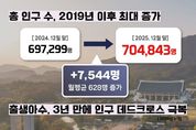 브릿지저널 정보영 기자 | 천안시는 지난해 5월 총인구 70만 명을 돌파한 이후 증가세를 이어가며 2019년 이후 최대 인구 증가 기록을 경신했다고 15일 밝혔다. 지난해 12월 말 기준 천안시 총인구(외국인 포함)는 지난해 같은 기간보다 7,544명(1.1%) 늘어난 70만 4,843명으로 집계됐다. 이는 2019년 이후 연간 증가치 중 최대 증가한 수치로 분석된다. 천안시 총인구는 지난해 5월 70만 403명을 기록한 이후 7월(785명), 9월(1,088명), 10월(666명) 등 매월 꾸준한 증가세를 보였다. 특히 9월에는 한 달 사이 1,000명 이상이 늘어나며 증가세가 가장 두드러졌다. 인구 통계적 지표 개선도 눈에 띈다. 지난해 출생아 수(3,711명)가 사망자 수(3,591명)를 앞지르며 3년 만에 ‘인구 데드크로스’를 극복했다. 천안시는 출산 친화적 사회분위기 확산을 위해 ▲7남매 다둥이 맘인 김소정 씨 출산장려 홍보대사 위촉 ▲출산장려 릴레이 캠페인 전개 ▲초중고 및 읍면동 찾아가는 인구교육 확대 운영 등 시민 인식제고 활동도 함께 추진해 정책효과를 높였다. 시는 임