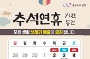 브릿지저널 김경미 기자 | 금천구는 추석 연휴 기간 생활쓰레기(일반생활쓰레기, 음식물쓰레기, 재활용품) 수거를 일시 중단한다고 밝혔다. 환경미화원들의 휴식권을 보장하고 안전한 근무 환경을 조성하기 위한 조치라고 구는 설명했다. 수도권매립지관리공사와 청소대행업체도 휴무다. 이에 따라 주민들은 10월 3일과 7일, 9~10일 오후 6시부터 자정까지 대형생활폐기물을 제외한 모든 생활쓰레기를 배출할 수 있다. 연휴 기간 중 생활쓰레기 배출이 금지되는 날은 2일과 4~6일, 8일, 11일이다. 구는 쓰레기배출이 일시 중단됨에 따라 주민 불편을 최소화하기 위한 청소상황실과 청소대행업체 기동반을 편성·운영한다. 쓰레기 관련 민원에 신속히 대응할 방침이다. 또한 연휴가 끝나는 10일부터는 인력과 장비를 총동원해 적체된 쓰레기를 일제 수거할 계획이다. 유성훈 금천구청장은 "평소에 묵묵히 금천의 청결을 책임지고 있는 환경미화원 분들께 감사드린다“라며 ”추석 연휴 기간 쓰레기 배출일을 꼭 확인하시어, 서로 배려하고 즐거운 명절을 보낼 수 있도록 주민 여러분의 많은 이해와 적극적인 참여를 부탁드린다”라고 말
