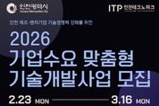 브릿지저널 김경미 기자 | 인천테크노파크(인천TP)는 지역 제조벤처기업의 기술경쟁력 강화를 위해 ‘2026년 기업수요 맞춤형 기술개발사업’의 참여기업을 오는 3월 16일까지 모집한다고 밝혔다. 이번 사업은 인천 소재 제조벤처기업 중, 최근 5년 이내에 민간 액셀러레이터(AC)나 벤처캐피탈(VC) 등 적격 투자기관으로부터 투자를 유치한 기업을 대상으로 한다. 총 6개 내외의 과제를 선정해 기업당 최대 7,500만 원의 기술개발비를 지원할 계획이다. 지원금은 신규 채용 인건비, 전문가 활용비, 시제품 제작 및 성능 시험·평가 등 사업화와 상용화에 필요한 제반 비용으로 활용할 수 있다. 특히 선정 기업은 스케일업TIPS 운영사를 통해 지식재산권(IP) 경영진단 등의 컨설팅을 받게 된다. 이 중 성과가 우수한 기업은 스케일업TIPS 운영사로부터 10억 원 규모의 직접 투자와 함께 스케일업TIPS 프로그램 추천 기회를 얻을 수 있다. 최종적으로 스케일업TIPS에 선정되면 향후 3년간 총 20~30억 원의 R·D 자금을 후속 지원을 받을 수 있다. 사업 신청은 3월 16일