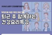브릿지저널 윤나영 기자 | 남원주건강생활지원센터는 직장인을 위한 영양 프로그램 ‘퇴근 후 함께하는 건강요리특강’ 참여자를 모집한다. 이번 프로그램은 대사증후군 예방·관리와 구강 청결 교육, 건강 요리 실습으로 구성되며, 오는 4월 30일 오후 6시 30분부터 8시까지 진행된다. 모집 대상은 지역 주민 10명 이내며, 신청은 4월 17일 오전 9시부터 센터 전화를 통해 선착순으로 접수한다. 자세한 사항은 남원주건강생활지원센터로 문의하면 된다.