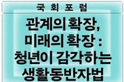 브릿지저널 김경미 기자 | 6 3 지방선거를 앞두고 다양한 청년정책이 발표되는 가운데, 청년 당사자가 직접 청년정책으로서 생활동반자법의 의미와 필요성을 조망하는 국회포럼이 개최된다. 이날 포럼에는 50여 명의 청년 당사자가 참석해 생활동반자법에 대한 의견을 나눌 예정이다. 기본소득당 용혜인 의원과 기본소득당 청년 대학생위원회는 4월 5일 오후 2시 국회의원회관 제3세미나실에서 '관계의 확장, 미래의 확장 : 청년이 감각하는 생활동반자법' 국회포럼을 개최한다. 용혜인 의원은 지난 1월 세상을 바꾸는 청년 캠페이너를 양성하는 ‘링크로스 아카데미’ 3기를 개최하고, 우수 참가자를 대학생특보로 위촉했다. 이번 국회포럼은 대학생특보가 청년 당사자로서 청년에게 필요한 제도 변화를 모색하며, 직접 포럼 기획과 진행을 맡았다. 이번 포럼에서는 용혜인 의원이 직접 위촉한 대학생특보 6인(김다희, 김서현, 나하은, 오채은, 이루리, 한빛나)이 여는 발제를 맡아, 청년의 삶에서 생활동반자법이 가지는 의미를 설명한다. 토론으로는 은둔고립청년 자조모임센터 '두더집' 운영자인 김예림 씨즈 전문위원, 이호림 무지개행동 공동