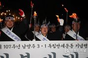 브릿지저널 김경미 기자 | 남양주시는 27일 화도읍 월산교회에서 남양주문화원 주최로 열린 3.1독립만세운동 기념행사가 성황리에 마무리했다고 밝혔다. 이번 행사는 남양주 지역에서 전개된 독립만세운동의 역사적 의미를 되새기고, 지역 독립운동 정신을 계승하기 위해 마련됐다. 행사에는 주광덕 남양주시장을 비롯해 조성대 남양주시의장, 남양주문화원장, 경기북부보훈지청장, 광복회 남양주시지회장, 도·시의원, 독립유공자 후손과 시민 등 300여 명이 참석해 독립 정신을 되새겼다. 행사는 총 3부로 운영됐으며, 1부에서는 기념식과 기념예배가 진행됐다. 시립합창단의 식전공연을 시작으로 기념예배, 주광덕 시장의 경축사와 독립선언서 낭독 등이 이어졌다. 2부에서는 월산교회에서 마석역 광장까지 ‘횃불 대행진’을 진행했다. 풍물패와 군부대의 인도 아래 시민들이 직접 횃불을 들고 행진하며 1919년 당시의 긴박했던 만세 운동 현장을 재현했다. 마지막으로 3부에서는 모든 참석자들이 마석역 광장에서 삼일절 노래 제창과 만세삼창을 외치며 행사의 대미를 장식했다. 주광덕 시장은 “3.1운동의 정신은 과거에 머물지 않고